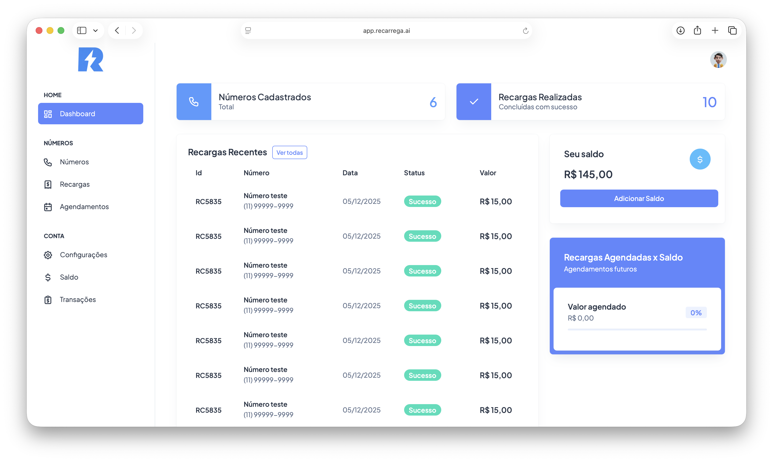 Controle e recarregue seus números de forma simples e prática. O Recarrega Aí permite a recarga em massa e evita perda de números por falta de saldo.